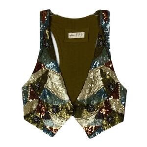 GODDESS OF BABYLON Vest Top S/M Sequins Beaded Gold Button Lined Rayon