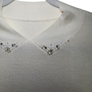 The elegant ivory color and mock neck design offer a timeless and sophisticated look. The beautiful beaded details add a touch of glamour, making it perfect for both casual and dressy occasions.