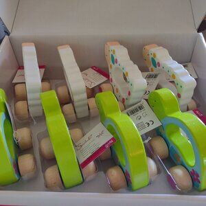 Characteristics: This set of two comes with one green turtle with multicolored flower details and a white sheep with squiggly pink and yellow details. Both of these smiley friends come with natural wooden wheels with bright pink accents. The pair also features an open center making it easy to carry them on the go!
