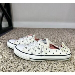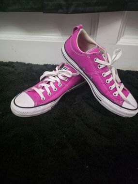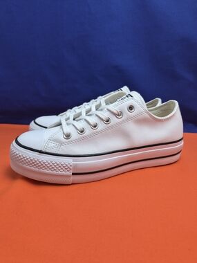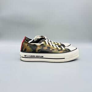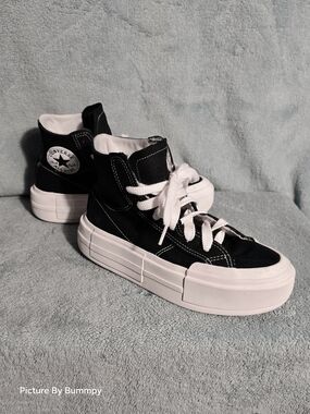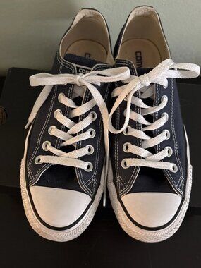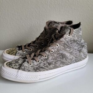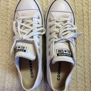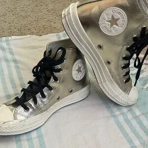 High-top Converse sneakers in metallic gold. Black laces and white rubber toe and sole. Classic All Star ankle patch. Sleek metallic finish for a bold look. Gently worn a few times.