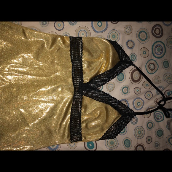 Bought at the exotic-wear store for $52. Very small and does not fit me or else I would wear it for a picture. It is more sized os/small. Very gorgeous, gold and sparkly. Looks wrinkly because it was in a ball on my night stand for a couple months lol. I lost the matching thong. This dress is in perfect condition no flaws that I can see!!!!! Just to small for me! Wash it on gentle and do not dry it! BUNDLE AND SAVE!
