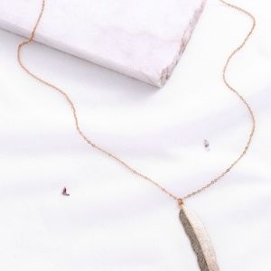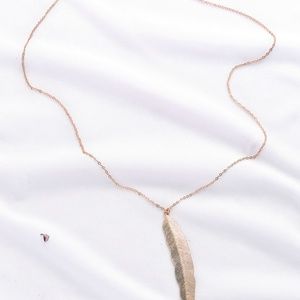 Gold feather pendant necklace. Pendant length 2 3/8". Satin gold tone. Chain length 24"