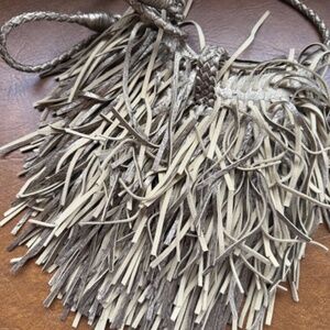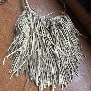 GOLD FRINGED SHOULDER BAG. STRAP IS 46 INCHES LONG. FRINGE ONBACK AND FRONT. ADORABLE SMALL PURSE. ONLY CARRIED A FEW TIMES, IN EXCELLENT CONDITION.