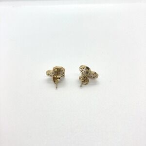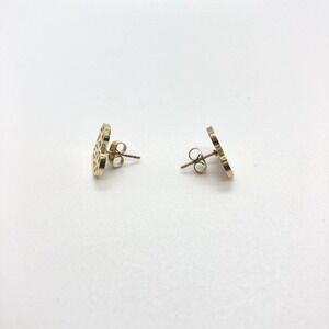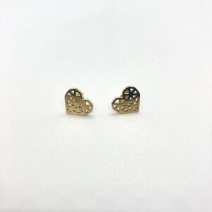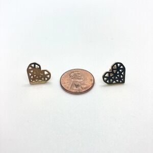A pair of golden geometric heart stud earrings. The face of the earring measures approx .5" in diameter. Shown next to a penny to indicate size. Made of yellow gold tone stainless steel.