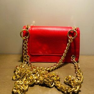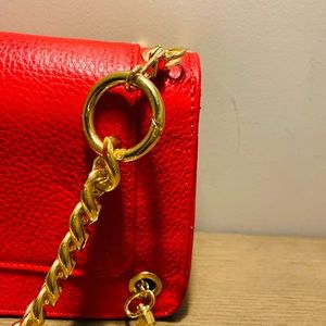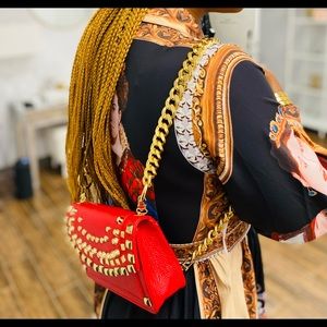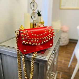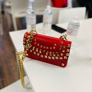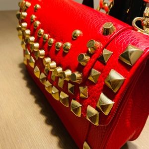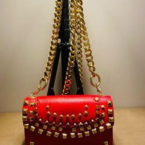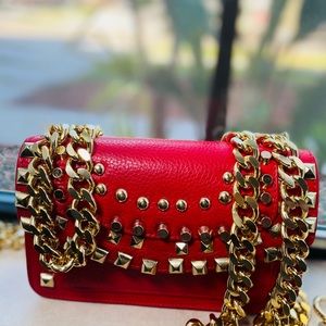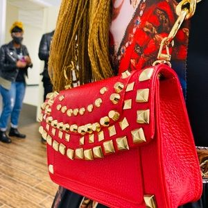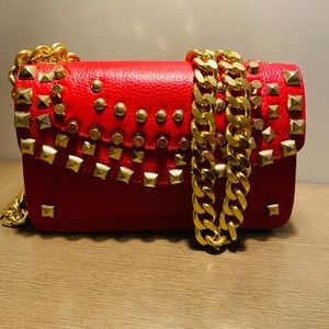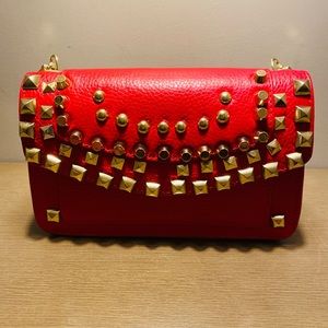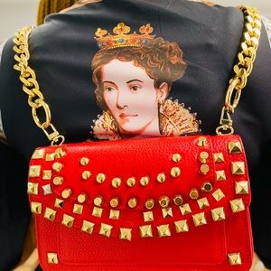 An iconic accessory that adds a touch of vibrant and timeless style to any look. The rich, deep red color Italian leather backpack offers a stylish and functional design. With a fun cross-body silhouette that can instantly be converted into a convenient and practical backpack, it features gold studded embellishments for an extra dose of classic appeal, plus dual compartments for ample room for storing your essentials and more.