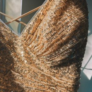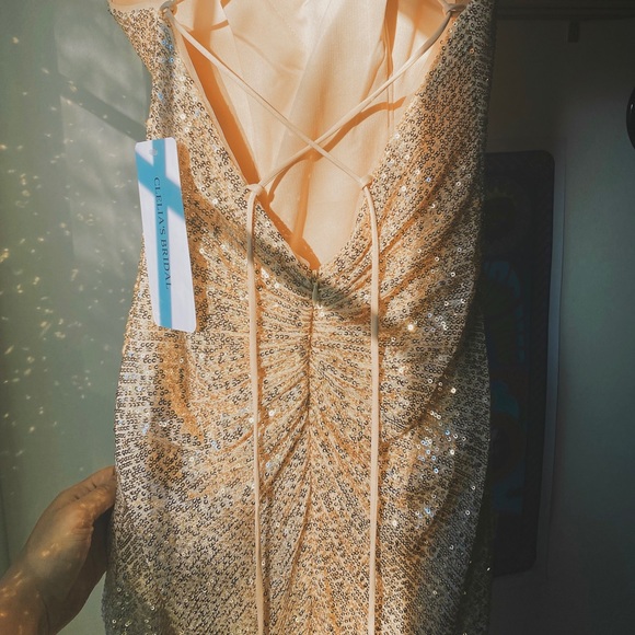 NEVER WORN Gold prom dress with sparkles and ruched side detail ✨✨✨This dress is seriously so gorgeous and sparkles like crazy. Not to mention how snatched it makes you look 🙌 Brand new with tags 🏷 Brand is from Cecilia’s Bridal