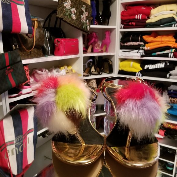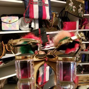 NEW GOLD COLOR SANDALS WITH LUCITE BLOCK HEEL AND MULTI COLOR POM POM