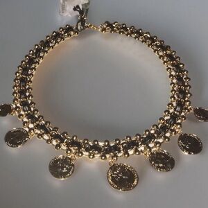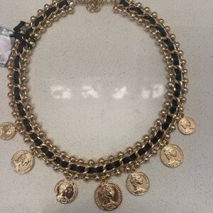 GOLD TONE AND BLACK RIBBON COIN CHARM DANGLE NECKLACE!!! This piece definitely makes a statement and is gorgeous on. Sits beautifully around neck . 17” with 4” extender. New tags!!!