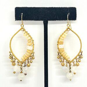 Beautiful GOLD TONE BEADED CHANDELIER DANGLE EARRINGS BOHO FAUX MOONSTONE YELLOW STONE. Gorgeous asymmetrical beaded wire wrapped design with faceted shades of white, yellow and gold bead dangles. Stones look like genuine moonstone and agate. Fish hook ear wires for pierced ears. Measures approximately: 2.5" h x 1.25" at its widest. Unsigned beauties. Great condition.