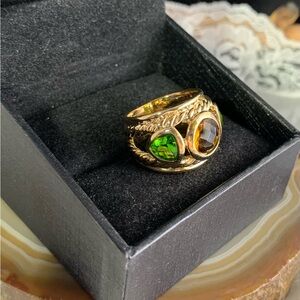 GOLD TONE BRAIDED ROPE STYLE RING WITH AMBER AND PERIDOT GLASS RING SIZE 7