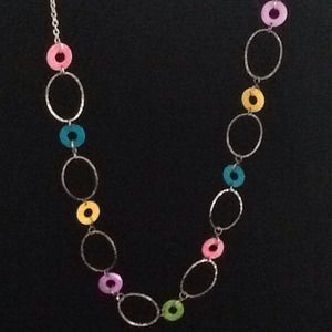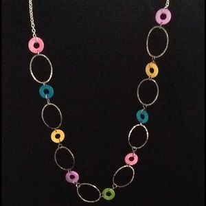 GOLD TONE OVAL CIRCLES THAT HAVE A HAMMERED LOOK ALONG WITH SMALLER ACRYLIC CIRCLES. LOBSTER CLAW CLOSURE
