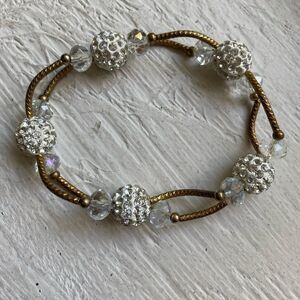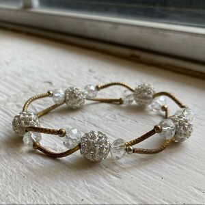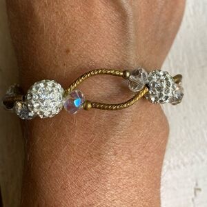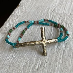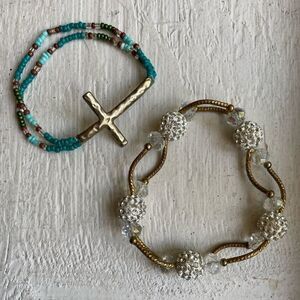 Like new Gold, beads and crystals stretchy bracelet set. EUC, great shape, stretchy to fit any wrist, 1st bracelet is gold with white and sparkly crystal accents, 2nd bracelet is a hammered gold cross with turquoise beads. See pictures for details.