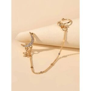 GOLD DIAMOND CRESCENT MOON STAR EARRING AND CHAIN EAR CUFF