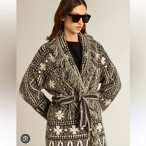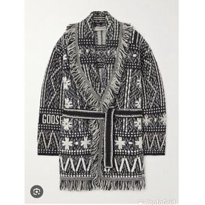 Golden Goose's 'Journey' collection is "an ode to Venice" - the place it calls home. This cardigan is knitted from soft alpaca and wool-blend with a graphic Fair Isle pattern and the brand's logo. It has tactile fringing along the shawl collar and a whipstitched sash belt at the waist.