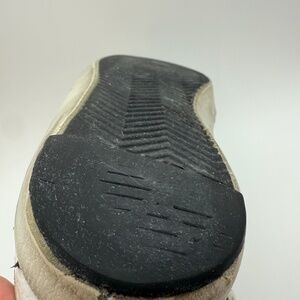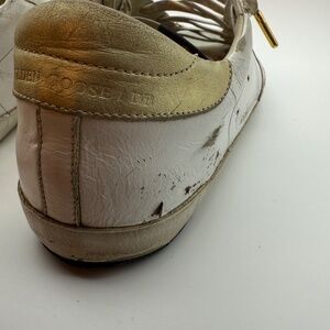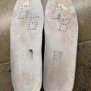 Worn but nice condition pair of Superstars. White with pink stars and gold heel back. Have gold Golden Goose laces ($100 by themselves). Have had the heels re-done by a cobbler. Some slight separation of the sole from the upper at the toe crease. Size 40.