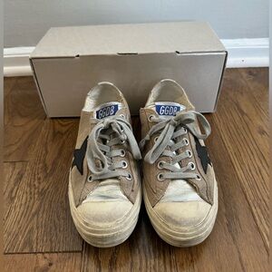 GOLDEN GOOSE V-STAR 2 in olive/taupe suede with black leather star. Tongue laminated leather in silver.