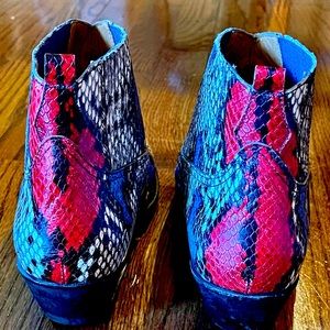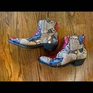 New in original box with dust bag leather snake print boots from Golden Goose, featuring a pointed toe, stitching details, a pull tab at the rear, a leather sole and a low block heel.