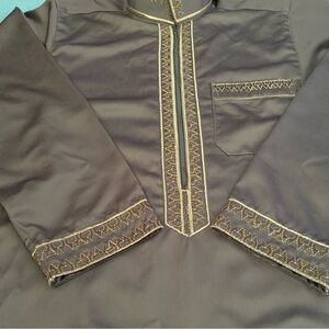 GOLDEN MOUNTAINS throbe prayer robe kaftan full length silky soft gray with gold embroidery 1/4 zip mock neck. Chest pocket and 2 side pockets. Luxury wear lightweight. Made in Egypt