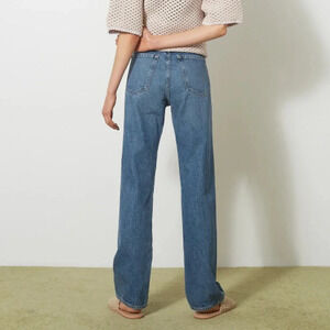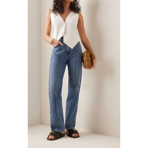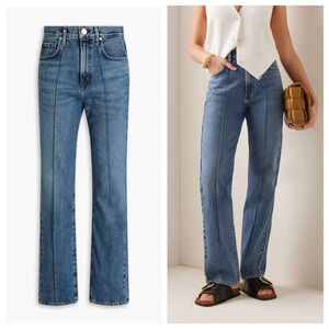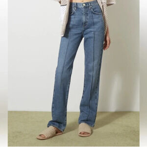 A classic Goldsign fit updated with stitched pintucks down front leg. High-rise premium denim in a straight-leg non-stretch denim jean. Five-pocket styling with belt loops and logo patch at waistband. Zip fly.