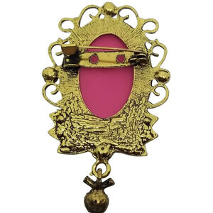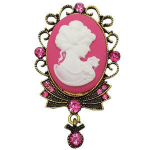 Lovely pink & white cameo made of polymer clay and framed with goldtone brooch set with pink glass rhinestones. Piece measures 2-5/8 inches tall and 1-1/2 inches wide. Great condition