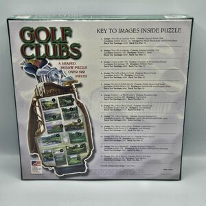 Factory-sealed Golf Clubs shaped jigsaw puzzle by Great American Puzzle Factory. Features 12 beautiful images of famous U.S. golf courses arranged in the shape of a golf bag filled with clubs. A great collectible or gift for golf and puzzle enthusiasts.