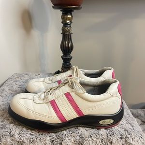 Ladies Leather ECCO Golf shoes. White with pink stripes on the side. Great condition, gently worn.