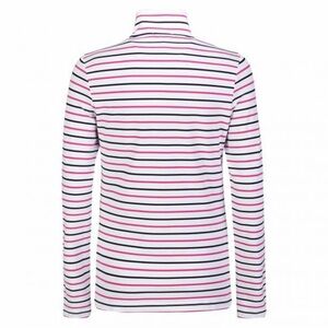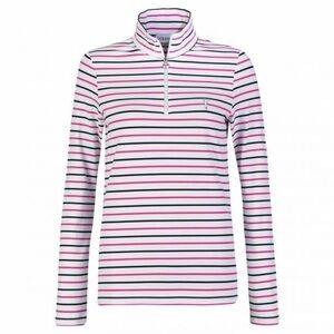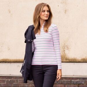 “Ladies' Dry Comfort jersey with stripes in the colours of the latest golf season. The super-light Lycra® material feels pleasant to the touch and adapts to your game effortlessly. The special yarn construction transports moisture to the outside quickly and keeps you dry even on intensive golf rounds. A popular base layer for the current golf season.”