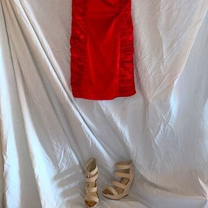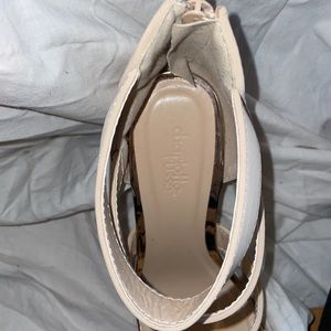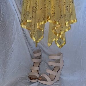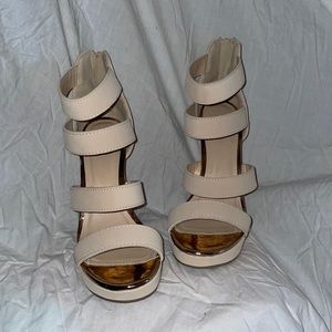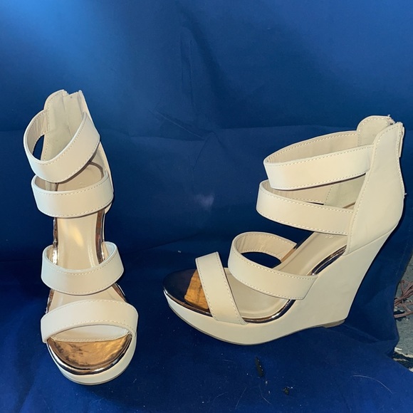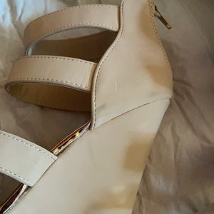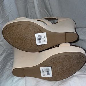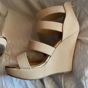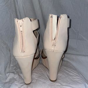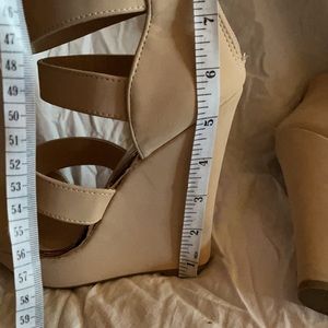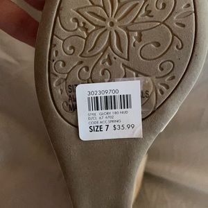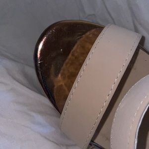 Tan and rose gold in color size 7 new with tags has zipper on back to help slip foot into non slip bottom. Has 4 straps in front. Cute for every day or dressing up! Has a few slight marks n a glue spot but we’re like that when I got them not noticeable unless looking close look at last two pictures for example.