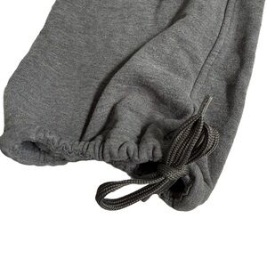 Dark gray sweatpants from Gongshow Hockey in a size XS. These sweatpants feature a thick ribbed, elastic waistband. They are full length and have drawstrings at the ankles that can be tied to make them jogger style. The sweatpants have “GONGSHOW” stitched on the thigh in pink. The pants are in good preloved condition. They are missing the drawstring at the waist and have been priced according to this flaw.