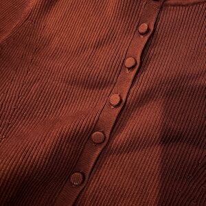This is a Good American Body Bodysuit in size 4, featuring a brick orange color with a ribbed texture and Henley neckline. The bodysuit has long sleeves, a pull-on closure, and includes gusset snaps, a thong back, and button front detail. Made of 78% viscose and 22% nylon, this is a stylish and versatile choice for women's clothing.