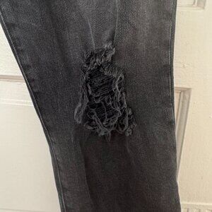 The jeans have distressing at the cuffs, on the pockets, and a few other spots on the jeans (see photos for the range of distressed-ness). The right knee is ripped (intentionally - I did not do this myself). These feel nice and thick - like classic denim, although they do have a tiny bit of stretch, which is always nice. But mostly just feel like jean-jeans! Three pockets in front, 2 in back, button and zipper fly, belt loops. The color is a really nicely faded black - it's the darker of the black colors in the photos, not gray at all (I lightened some slightly to show detail). I tried to find a product shot, but apparently they make 900 versions of ripped black jeans, so I have no idea which ones these are!