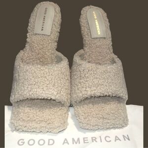 GOOD AMERICAN CREAM VEGAN SHEARLING SHERPA OPEN TOE MULE 4" HEELS NWT/NIB 🤎🤎