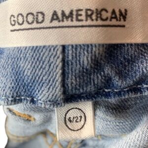 Good American (style GAB103, Blue039 colorway: a light blue wash with distressing and tears at the knees.