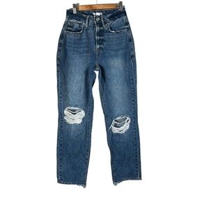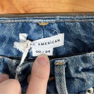 GOOD AMERICAN Good Vintage w/ Jagged Step Hem GV050T Indigo 043. 100% cotton. Sitting high on the waist, they’re shaped with breezy straight legs and fitted with a twisted hem down the legs. Button and zip-fly fastening. Slim fit, high rise, straight leg, belt loops, five buttons, silver-toned hardware, rips at knees, whiskering, faded wash, distressed trims. Size 00 or 24.