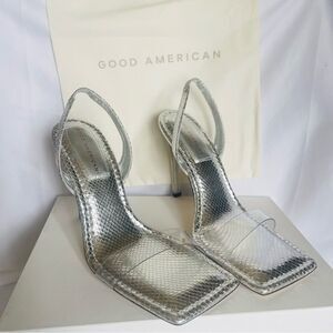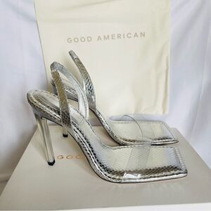 GOOD AMERICAN Heels Silver Snake Lucite Heels Size 12 square toe