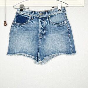 GOOD AMERICAN High Waist Distressed Bombshell Denim Shorts Raw Hem 2/26 NWT