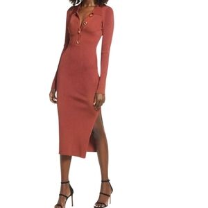 GOOD AMERICAN POLO LONG SLEEVE STRETCH KNIT MIDI BRICK COLOR DRESS
