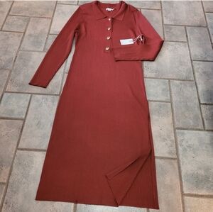 GOOD AMERICAN POLO LLONG SLEEVE STRETCH KNIT MIDI BRICK COLOR DRESS