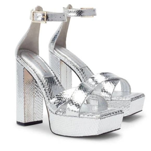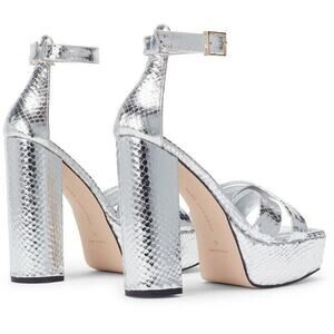 GOOD AMERICAN Snake Embossed High Block Heel Platform Sandals Silver 12 NEW
