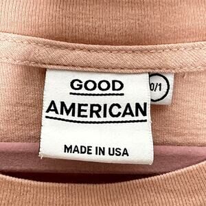 Premium cotton oversized t-shirt with Good American logo on front. Features locker label at bottom hem.