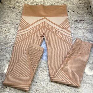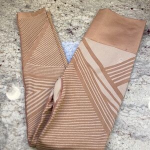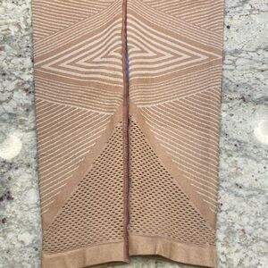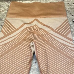 Excellent condition. Thick, soft leggings that hold up great! Beautiful rose color. Geometric design. Mesh detailing at ankle. One small snag on left hip caused by tag removal. No stains or holes. Measurements included in photos. Smoke free home.