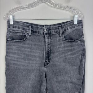 Nice black wash (almost gray) jeans by Good American. Distressing at the knees. High rise. Zipper and button closure. These have some wear and a small mark as shown but plenty of life left!! Women’s size 15.