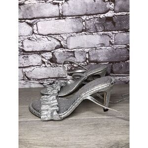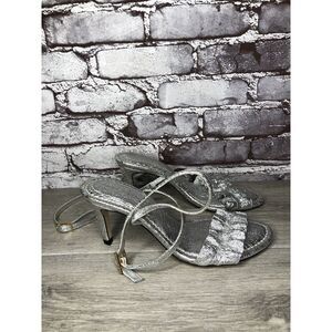 Selling GOOD AMERICAN Metallic Silver Leather Strap Heeled Sandals Women’s Sz 7M US/37.5EU