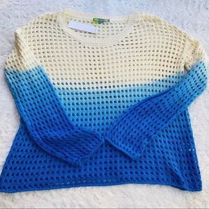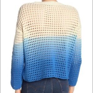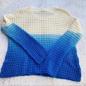 An ombre print accents a sweater featuring open stitch construction for a trendy twist on a bohemian style. - Crew neck - Long drop shoulder sleeves - Slips on over head - Ombre print - Open stitch construction -measurements are flat and approximate.smoke free home