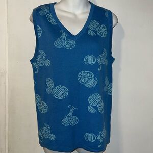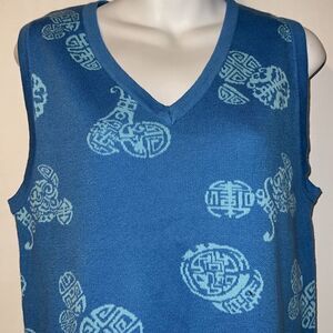 New! Blue cotton knit sweater vest with v neck collar and light blue pendant design. Washable. Size medium, measures 18” from armpit to armpit and 26” from top of shoulder to bottom hem.