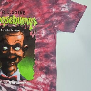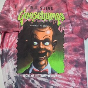 Show off your love for R.L. Stine's iconic Goosebumps series with this Scholastic T-Shirt. Featuring a red tie-dye background and a graphic print of the "Night of the Living Dummy" character, this shirt is perfect for horror fans and those who grew up in the 90s.