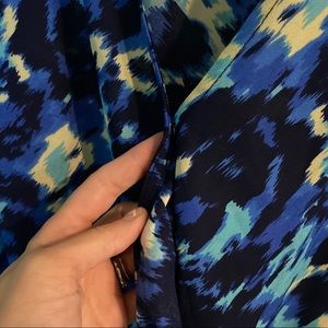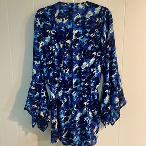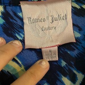 LIKE NEW Romeo & Juliet Couture romper. Worn once for dinner on vacation. All over abstract print; allover pattern of shades of blue. Surplice neck; snap button front closure; Handkerchief long sleeves; elastic waistband; Material: 100% polyester. Size M. Measurements: Approx 31” length, 1.5” inseam, 20” armpit to armpit. BRAND NEW condition.