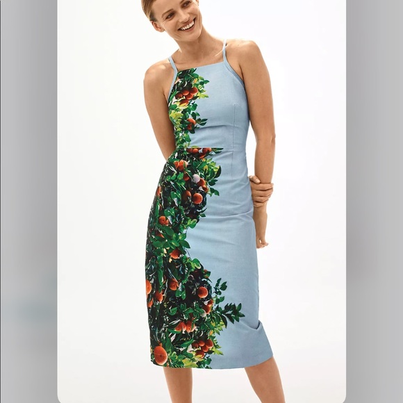 Featuring an orange grove print that's ripe for the picking, this tailored dress brings a playful touch to seasonal occasions.