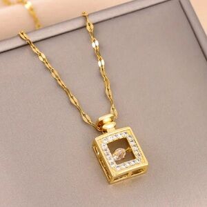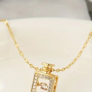 Suspended from a dainty and shimmering gold chain, this necklace is the perfect accessory to add a touch of sophisticated glamour to any ensemble. Whether you're dressing up for a special occasion or adding a subtle sparkle to your everyday look, this "Diamond Filled Perfume Bottle Necklace" is sure to turn heads and become a cherished piece in your jewelry collection. It makes a thoughtful and stylish gift for anyone who appreciates timeless elegance and a hint of sparkle.