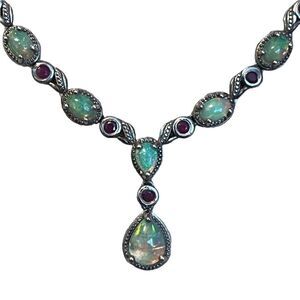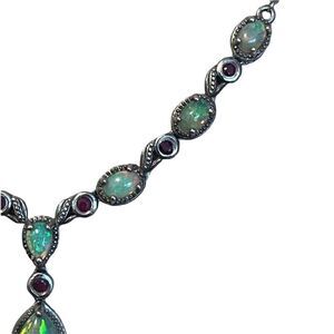 Absolutely gorgeous Ethiopian welo opal and nissa ruby drop necklace. The opals are stunning in person. Platinum over sterling silver. 18” long with a 2” extender. Total carat weight is 3.92.
